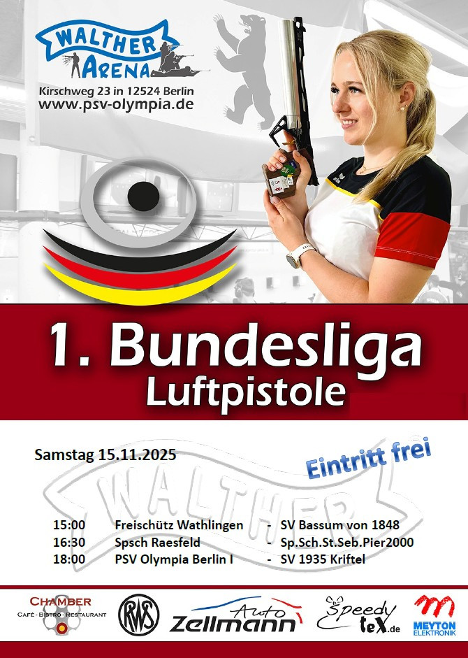Am 15.11.25 wird es in der Walther-Arena bei einem Schießwettkampf laut! Denn es steht der Heimkampf der Bundesligamannschaft Luftpistole des PSV Olympia Berlin an. Am Nachmittag treffen sich in der Walther-Arena 6 Teams der 1.Bundesliga der Gruppe Nord, um Punkte im Kampf Team gegen Team für die aktuelle Saison zu sammeln. Im Gegensatz zu allen anderen schießsportlichen Wettkämpfen ist hierbei ausdrücklich Unterstützung seitens des Publikums durch klatschen, anfeuern oder auch mit kleinen Lärminstrumenten erwünscht.